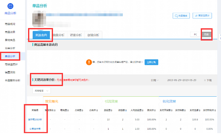 进入单品分析页面查看我们要看的产品,然后选择来源去向—无线端—鼠标往下滑找到关键词效果分析模块。